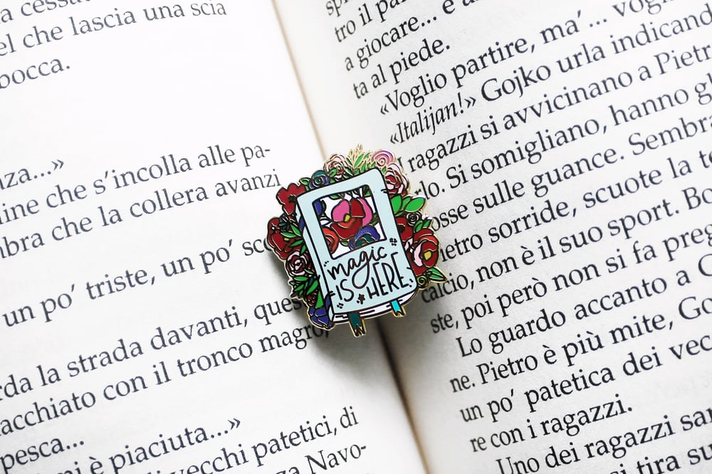 Spilla in metallo "Magic is here" per tutti gli amanti dei libri.