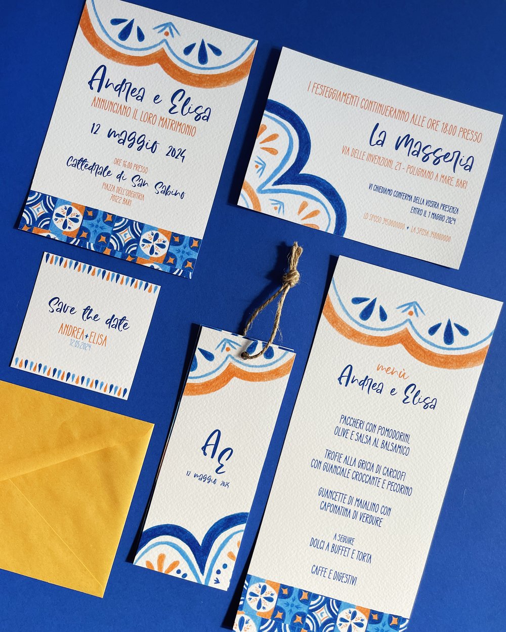 "BLUE" è un wedding set illustrato che puoi personalizzare per il tuo giorno speciale.