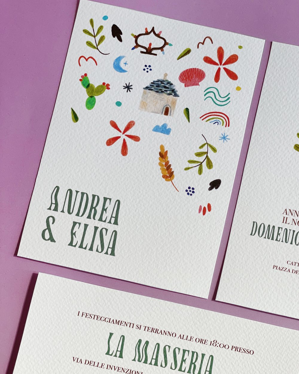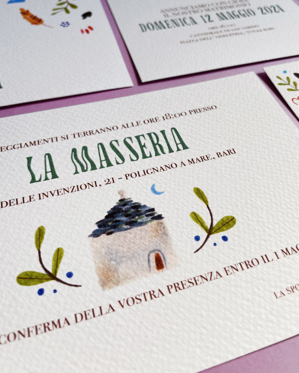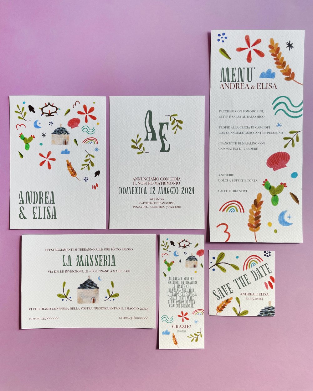 "PUGLIA" è un wedding set illustrato che puoi personalizzare per il tuo giorno speciale.